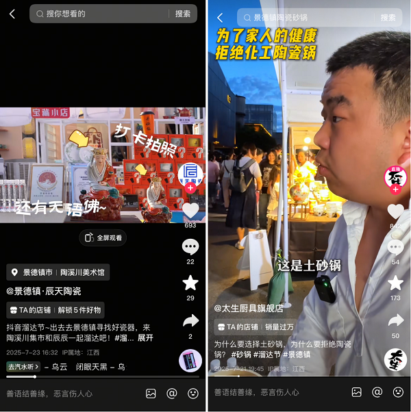 这种线下场景与线上内容相结合的创新模式,成功将线下市集的聚合效应延伸至线上,创造了实实在在的增长价值。例如,@景德镇华清陶瓷花瓶花器 就借助此次线下市集的契机,尝试将市集场景内容化,通过真实、生动的内容迅速吸引了大量关注,不仅让店铺曝光量提升了 245%,全店 GMV 更是实现了160% 的增长。